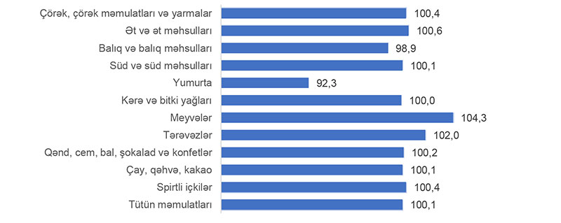 2020-ci ilin aprel ayında ərzaq məhsulları, içkilər və tütün məmulatları üzrə istehlak qiymətləri indeksi əvvəlki aya nisbətən 100,7 faiz, əvvəlki ilin aprel ayına nisbətən 106,0 faiz təşkil etmişdir.
