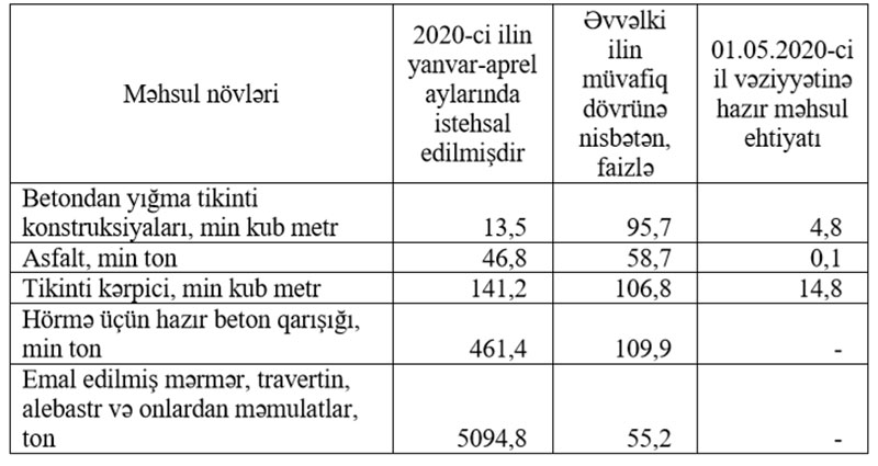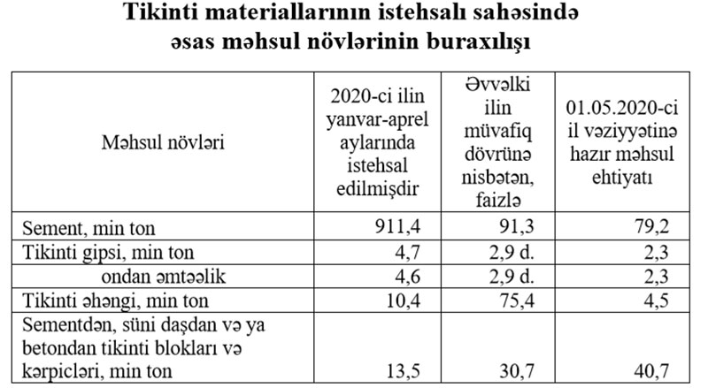 Dövlət Statistika Komitəsinin aylıq hesabatında bildirilir ki, tikinti gipsinin istehsalı 2,9 dəfə, hörmə üçün hazır beton qarışığının istehsalı 9,9 faiz, tikinti kərpicinin istehsalı 6,8 faiz artmış, betondan yığma tikinti konstruksiyalarının istehsalı 4,3 faiz, sementin istehsalı 8,7 faiz, tikinti əhənginin istehsalı 24,6 faiz, asfaltın istehsalı 41,3 faiz, emal edilmiş mərmər, travertin, alebastr və onlardan məmulatların istehsalı 44,8 faiz, sementdən, süni daşdan və ya betondan tikinti blokları və kərpiclərinin istehsalı isə 69,3 faiz azalmışdır.