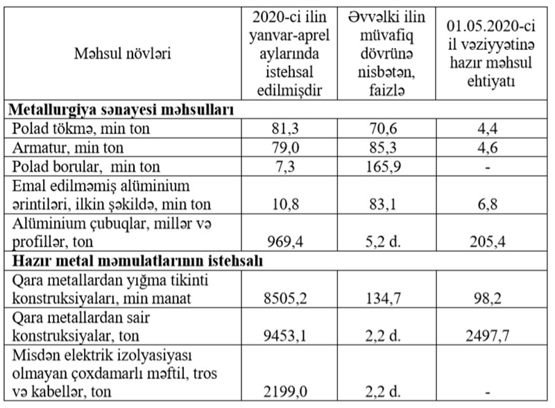 2020-ci ilin yanvar-aprel ayları ərzində tikinti materiallarının istehsalı sahəsində istehsalın ümumi dəyəri 203,9 milyon manat olmaqla, əvvəlki ilin müvafiq dövrü ilə müqayisədə 4,5 faiz azalmışdır.