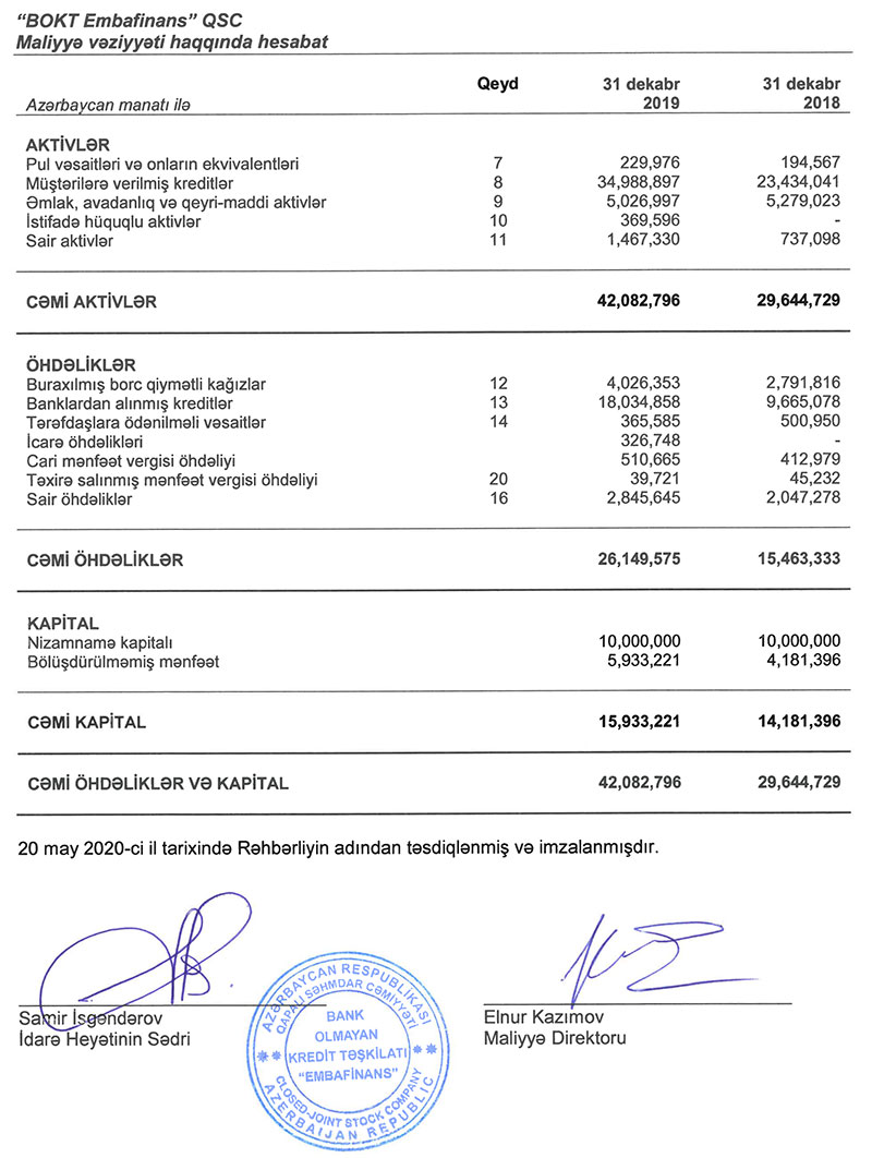 Bank Olmayan Kredit Təşkilatı “Embafinans” QSC Beynəlxalq Maliyyə Hesabatları Standartlarına uyğun maliyyə nəticələrini dərc edib. Maliyyə hesabatlarına “PraysvoterhausKupers Audit Azərbaycan” şirkəti (PwC Azerbaijan) rəy verib.