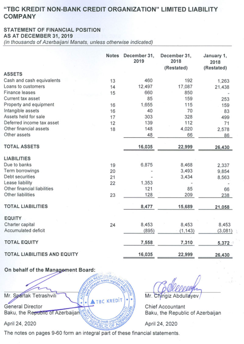 Ötən il TBC Kredit-in kredit portfeli 4 milyon 590 min manat və ya 26,8% azalaraq 12 milyon 497 min manata geriləyib. Təşkilatın cəmi aktivləri isə 22 milyon 999 min manatdan 16 milyon 35 min manta düşüb.