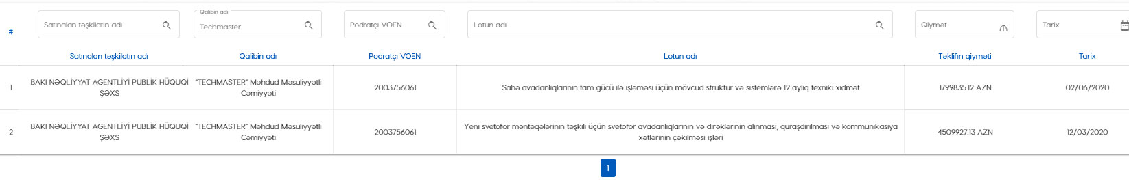 Bakı Nəqliyyat Agentliyinin elan etdiyi “Sahə avadanlıqlarının tam gücü ilə işləməsi üçün mövcud struktur və sistemlərə 12 aylıq texniki xidmətin” satınalınmasına dair tenderin qalibinin “Techmaster” MMC (VÖEN: 2003756061) olduğu açıqlanıb.
