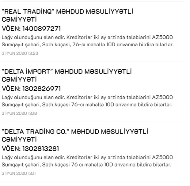 “Real Tradinq” MMC (2006-cı ildə yaradılıb), “Delta İmport” MMC (2012) və “Delta Trading Co” MMC-nin fəaliyyətinə xitam verilir (2012).