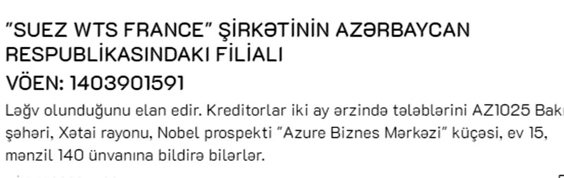 "Suez WTS France" şirkətinin Azərbaycan Respublikasındakı filialı ləğv olunduğunu elan edib.