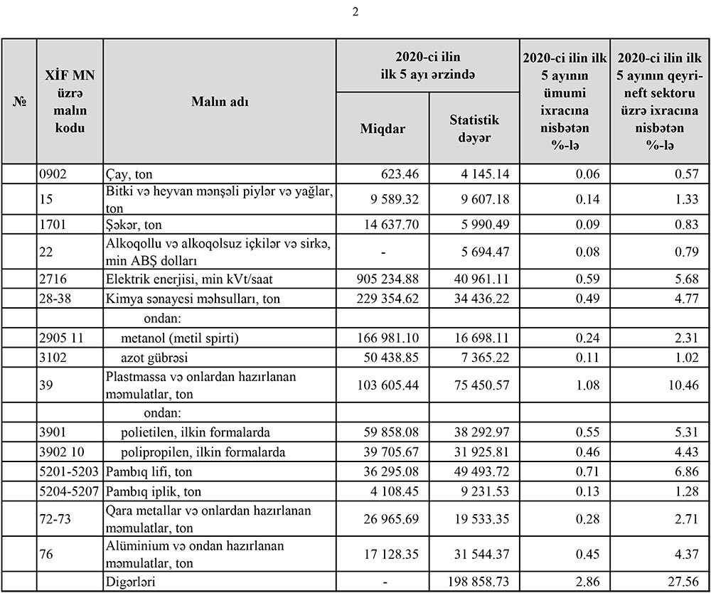 2020-ci ilin yanvar-may ayları ərzində (ilk 5 ayda) Azərbaycanın ən çox ixrac və idxal etdiyi mallar.