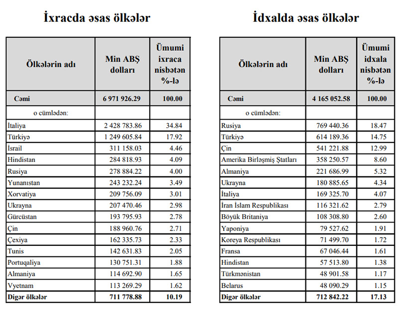 Qeyd edilən dövrdə Azərbaycanın Türkiyəyə ixracı 267 milyon 2 min dollar artaraq 1 milyard 249 milyon 605 min dollar, Çinə ixracı isə 414 milyon 27 min dollar azalaraq 188 milyon 960 min dollar təşkil edib.