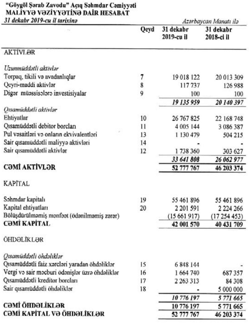 “Göygöl Şərab Zavodu” ASC 2019-cu il dekabrın 31-nə mühasibat balansını yarımçıq dərc etdirib, şirkət mənfəət və zərər hesabatını gizlədib.