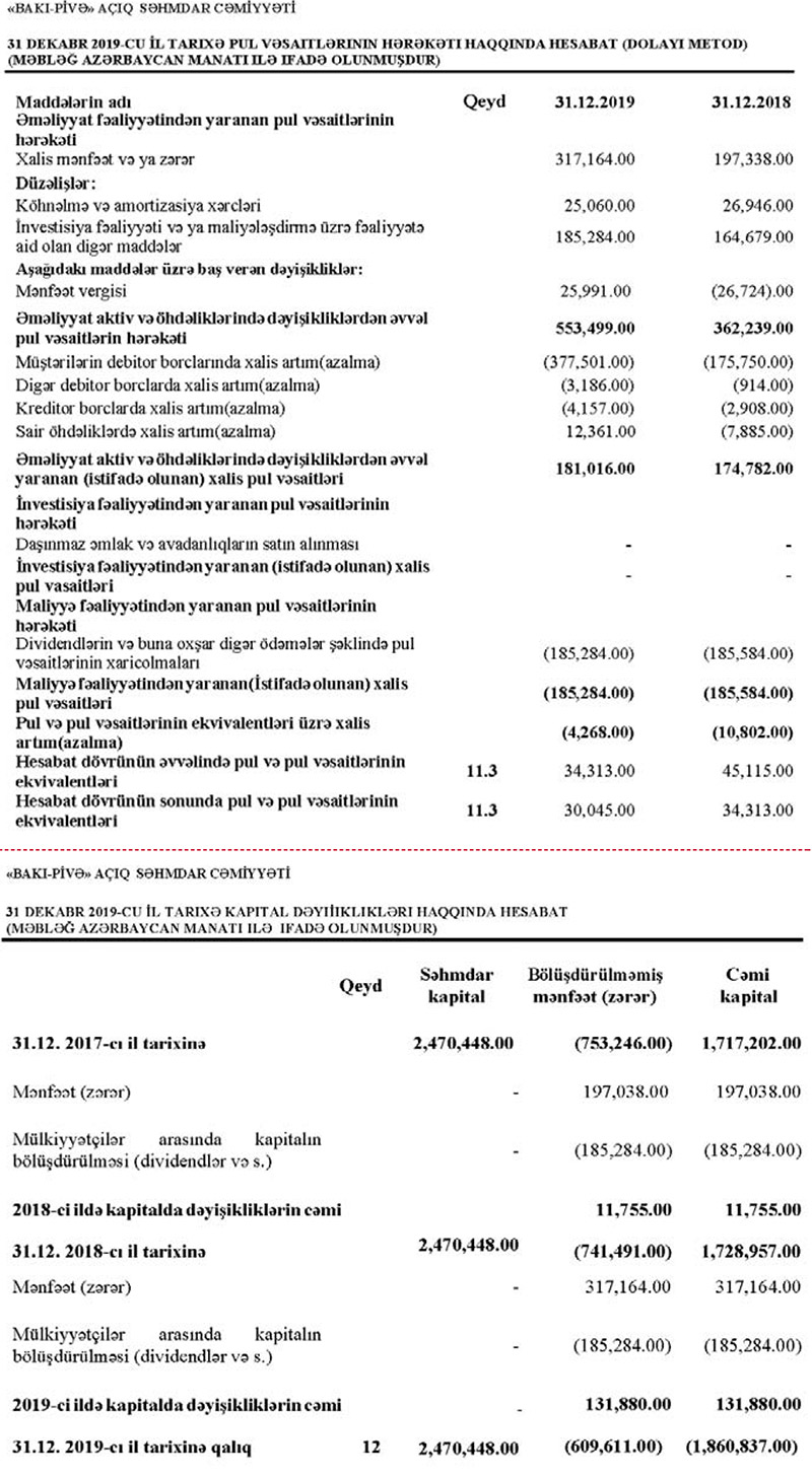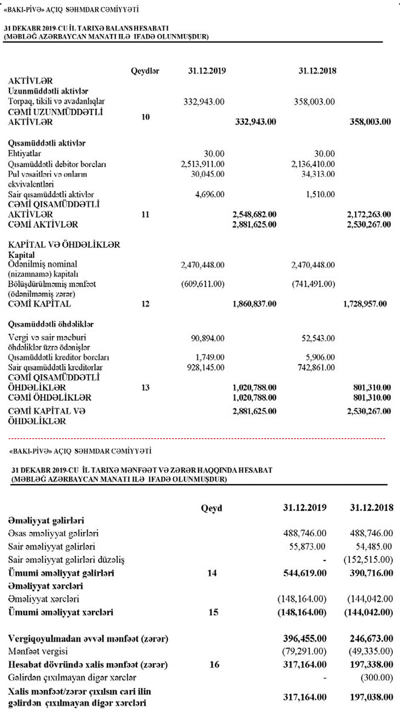“Bakı Pivə” ASC 2019-cu ili 317 min 164 manat xalis mənfəət ilə başa vurub. 2018-ci illə müqayisədə 2019-cu ildə “Bakı Pivə”nin xalis mənfəəti 61% artıb. ASC 2018-ci ili 197 min 38 manat xalis mənfəət ilə bağlamışdı.