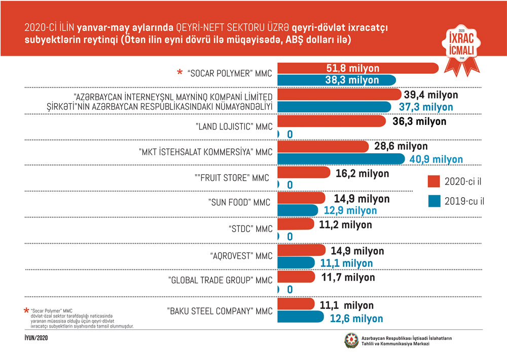 Marja xəbər verir ki, “İxrac İcmalı”nın may sayında qeyri-neft sektoru üzrə əsas ixracatçı şirkətlərin reytinqi verilib. Bu ilin yanvar-may ayları üzrə hazırlanan qeyri-dövlət ixracatçı subyektlərin reytinqində ilk onluqda aşağıdakı şirkətlər təmsil olunurlar: “Socar Polymer” MMC, "Azərbaycan İnterneyşnl Mayninq Kompani Limited Şirkəti"nin Azərbaycan Respublikasındakı nümayəndəliyi, “Land Lojistic" MMC, "MKT İstehsalat Kommersiya" MMC, “Fruit Store" MMC, "Sun Food" MMC, “STDC” MMC, "Aqrovest" MMC, "Global Trade Group" MMC və "Baku Steel Company".