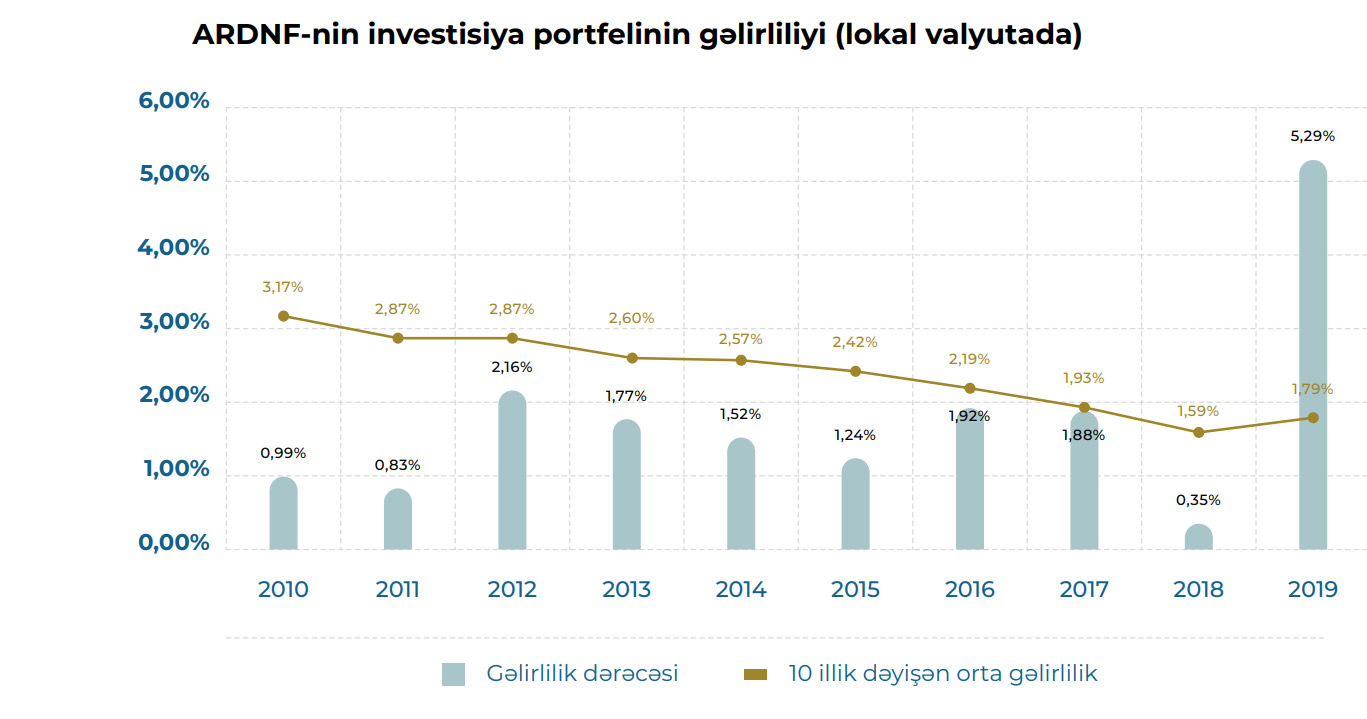 2019-cu ildə Azərbaycan Respublikası Dövlət Neft Fondunun (ARDNF) ümumi investisiya portfelinin gəlirliliyi 5,29% təşkil etmişdir. Fond 2018-ci ili 0,35% gəlirlilik ilə başa vurmuşdu.