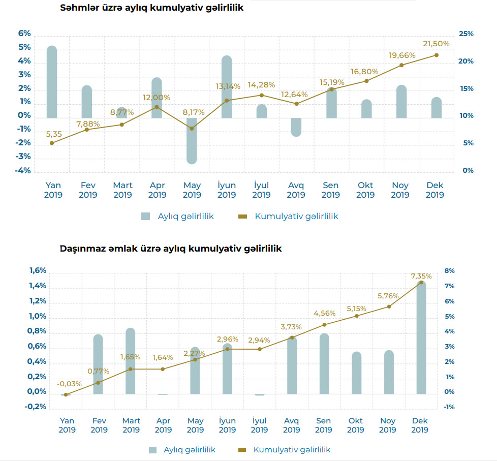 Marja Fondun illik hesabatına istinadən xəbər verir ki, 2019-cu ildə sabit gəlirli qiymətli kağızlar portfeli üzrə illik gəlirlilik 3,02%, səhm portfeli (özəl səhmlər daxil olmaqla) üzrə 21,50%, daşınmaz əmlak portfeli üzrə isə 7,35% təşkil etmişdir. İnvestisiya portfelinin toplam gəlirliliyinə (5,29%) sabit gəlirli qiymətli kağızlar portfelinin töhfəsi 2,21%, səhm (özəl səhmlər daxil olmaqla) və daşınmaz əmlak portfellərinin töhfəsi isə müvafiq olaraq 2,67% və 0,41% təşkil etmişdir.