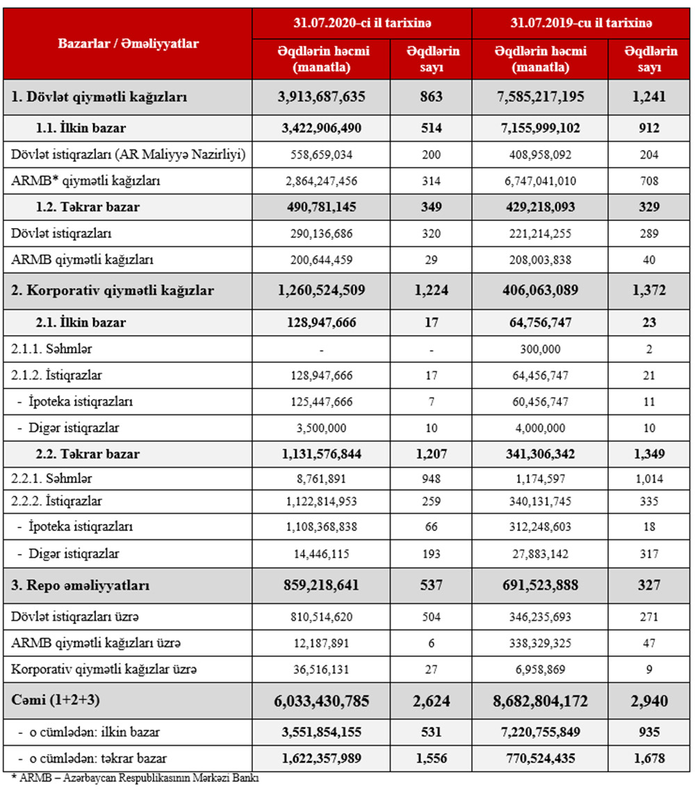 “Nəticə olaraq, 2020-ci ilin yanvar-iyul ayları üzrə Mərkəzi bank qiymətli kağızları üzrə yerləşdirmələrin həcmində ötən ilə nəzərən azalma müşahidə olumasına baxmayaraq, ümumi təkrar bazar üzrə ticarət həcmində 111%, repo əməliyyatları üzrə isə 24% böyümə qeydə alınmışdır”,- Birjanın məlumatında deyilir.