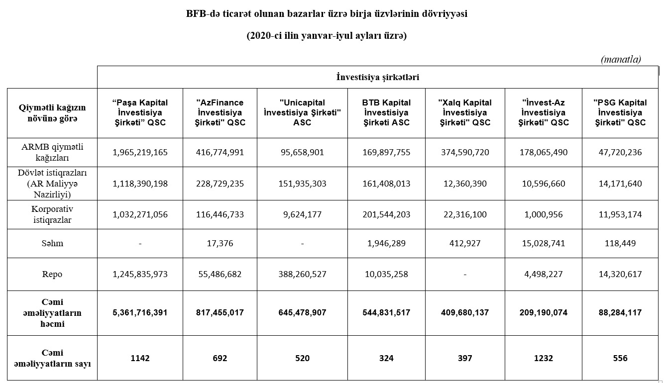 Marja Birjaya istinadən xəbər verir ki, 2020-ci ilin yanvar-iyul ayları ərzində “Paşa Kapital İnvestisiya Şirkəti” QSC 5 milyard 361 milyon 716 min manat dövriyyə ilə 1-ci, "AzFinance İnvestisiya Şirkəti" QSC 817 milyon 455 min manat dövriyyə ilə 2-ci, "Unicapital İnvestisiya Şirkəti" ASC 645 milyon 478min manat dövriyyə ilə 3-cü olub.