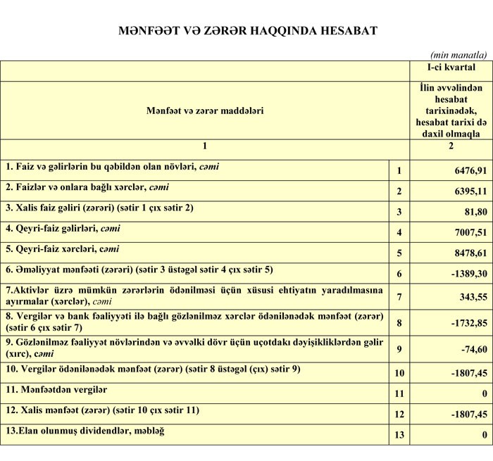 2016-cı ilin yekunları üzrə 35 milyon 630 min manat zərər açıqlamış “AGBank” ASC, 2017-ci ilin 1-ci rübünü 1 milyon 807 min manat zərər ilə başa vurub. Müqayisə üçün qeyd edək ki, Bank 2016-cı ilin 1-ci rübündə 6 milyon 628 min manat zərər etmişdi. Beləliklə, rüblük müqayisədə Bankın zərəri 3,7 dəfə azalıb.