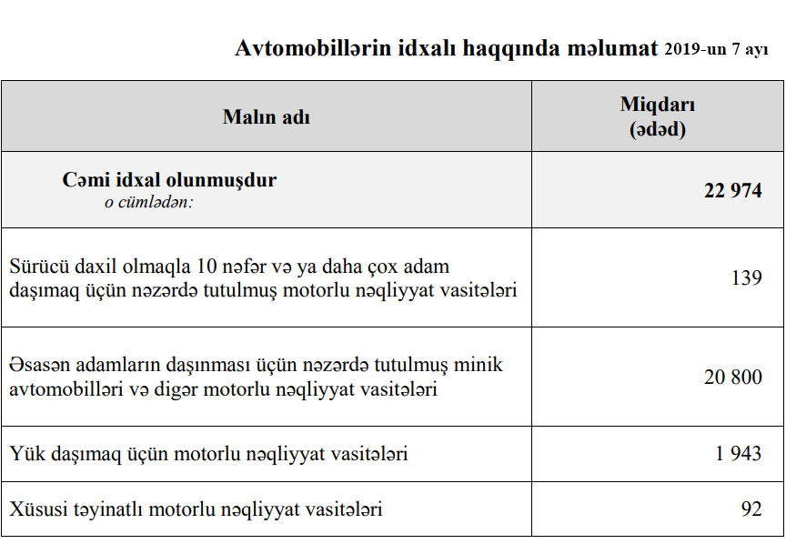 Cari ilin 7 ayında ayda ölkəmizə 25 min 999 ədəd minik avtomobili, 101 ədəd avtobus, 1 615 ədəd yük avtomobili və 77 ədəd xüsusi təyinatlı avtomobil idxal edilib.