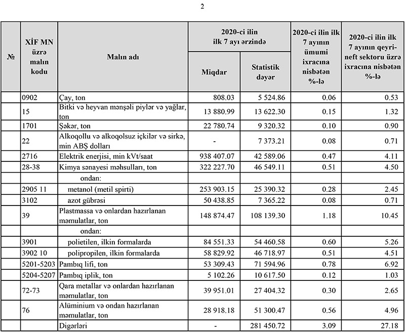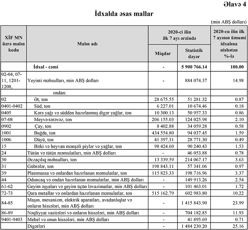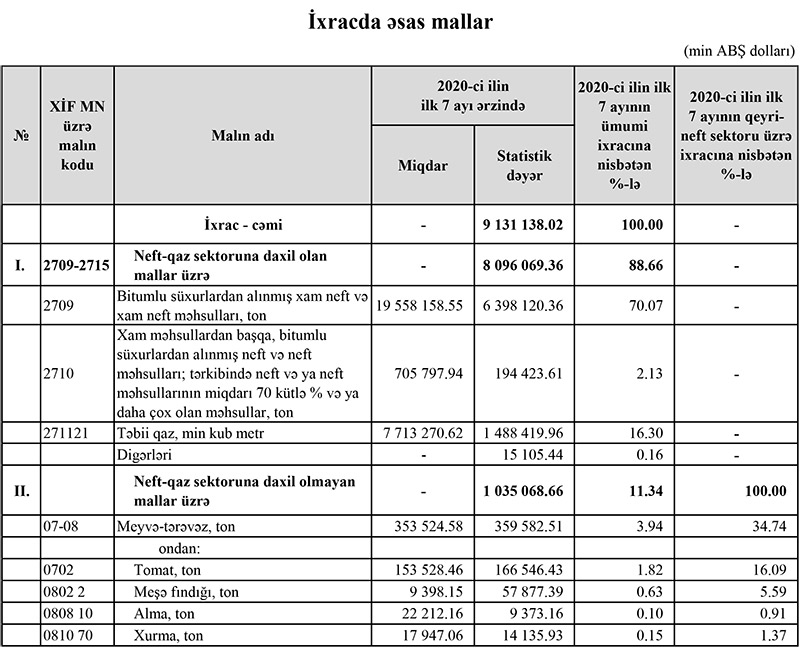 2020-ci ilin yanvar-iyul ayları ərzində (7 ayda) Azərbaycanın ən çox ixrac və idxal etdiyi mallar.