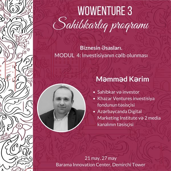 Proqrama qatılan iştirakçılar biznesin əsaslarını, komandanı qurub idarə etməyi, məhsulun bazara çıxarılmasını, marketinq və maliyyə məsələlərini, investorların qarşısında çıxış etməyi, maliyyə planı hazırlamağı öyrənəcəklər. Sonda onların layihəsi investor tərəfindən qiymətləndiriləcək. Hətta biz növbəti addım olaraq, uğurlu layihələrə investisiya cəlb olunmasına da dəstək ola bilərik".