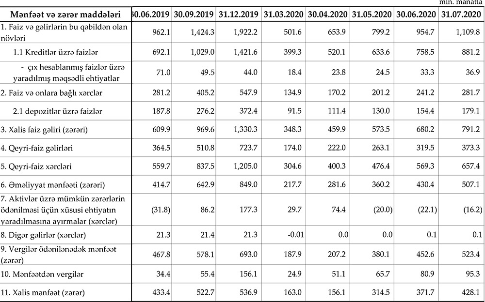 31 İyul 2020-ci il tarixində Azərbaycanın bank sektorunun xalis mənfəəti 428,1 milyon manat təşkil edib.