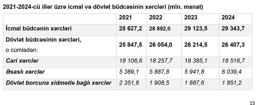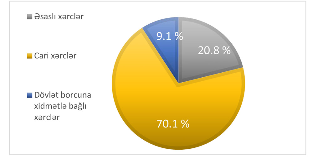 2021-ci ildə dövlət büdcəsinin xərcləri 25 847,5 mln. manat məbləğində proqnozlaşdırılır. Xərclərin 18 106,6 milyon manat və ya 70,1 faizini cari xərclər, 5 389,1 milyon manat və ya 20,8 faizini əsaslı xərclər, 2 351,8 milyon manat və ya 9,1 faizini dövlət borcuna və öhdəliklərinə xidmətlə bağlı xərclər təşkil edir.