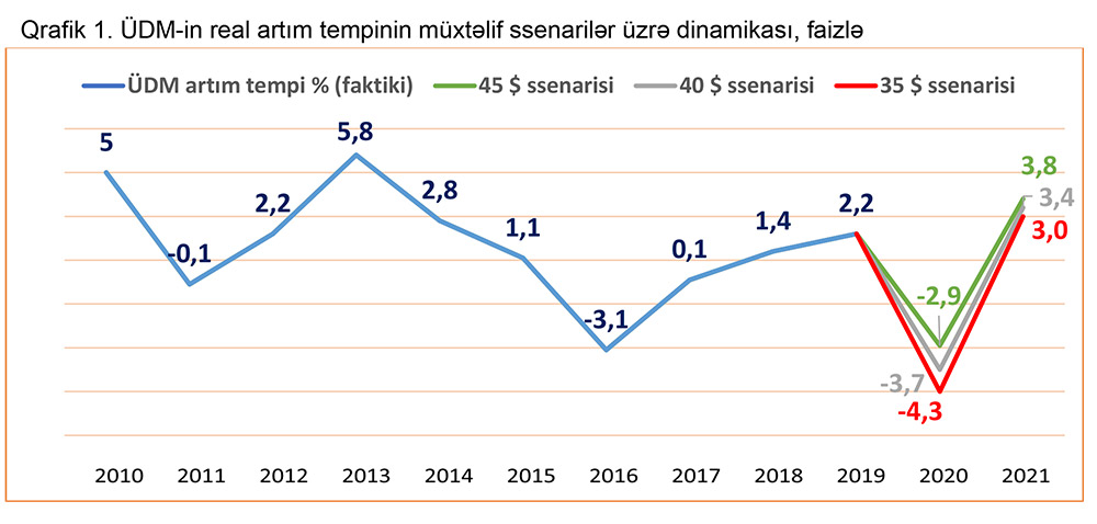 Azərbaycan Respublikasının İqtisadiyyat Nazirliyi tərəfindən hazırlanmış 3 ssenari üzrə (neftin qiyməti 35, 40, 45) proqnozlara əsasən 2020-ci ilin sonunda ÜDM-in azalması gözlənilir.