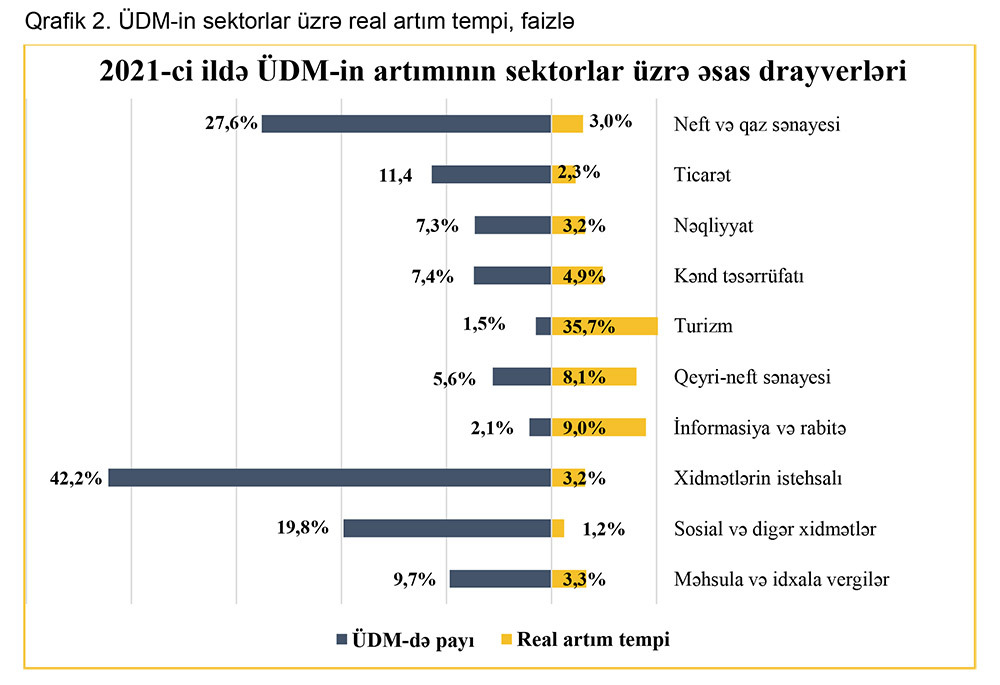 2021-ci ildə sahə strukturuna görə ümumi daxili məhsulun pay bölgüsündə ən böyük (33,2 faiz) çəkiyə malik sənayedə 25,0 milyard manatlıq, kənd təsərrüfatında 5,6 milyard manatlıq (xüsusi çəkisi 7,4 faiz), tikintidə 5,7 milyard manat, xidmətlərin istehsalında isə 31,8 milyard manat həcmində əlavə dəyər istehsal ediləcəyi gözlənilir. Məhsula və idxala xalis vergilər ÜDM-in strukturunda 9,7 faizə bərabər xüsusi çəkiyə malik olmaqla 7,3 milyard manat təşkil edəcəkdir.