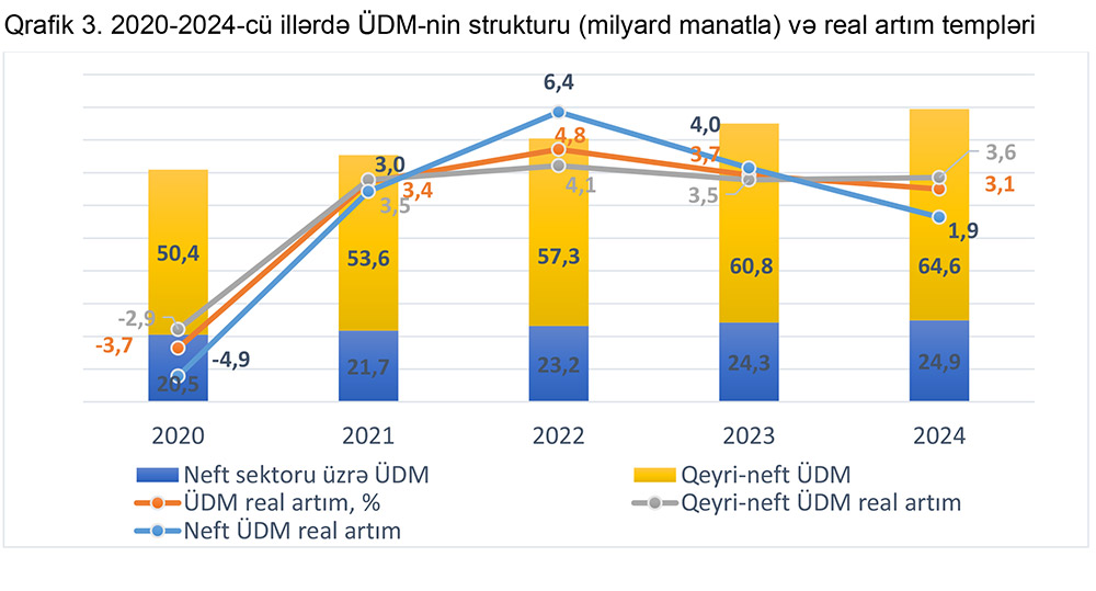 2021-ci il və ortamüddətli dövrdə iqtisadi artım templərinin nisbətən bərpa edilməsi ilə ölkədə ÜDM-in həcmi 2024-cü ildə 89,5 milyard manata qədər artacaqdır. Qeyd edək ki, qeyri-neft ÜDM növbəti ildə 3,5 faiz real artımla 53,6 milyard manat təşkil edəcəyi gözlənilir.