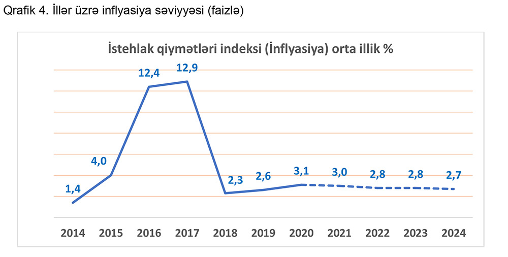Cari ildə məcmu tələbin daralması, inflyasiya gözləntilərinin aşağı olması şəraitində inflyasiya səviyyəsinin 3,1 faizə bərabər olacağı proqnozlaşdırılır. Qlobal iqtisadiyyatda neft qiymətləri, dünya bazarında ərzaq qiymətlərinin gözləntiləri, pul kütləsinin artım tempi və sair digər amillərin fonunda növbəti ildə inflyasiya göstəricisi mülayim 3,0 faiz, sonrakı üç ildə də 2,7- 2,8 faiz ətrafında olacağı proqnozlaşdırılmışdır.