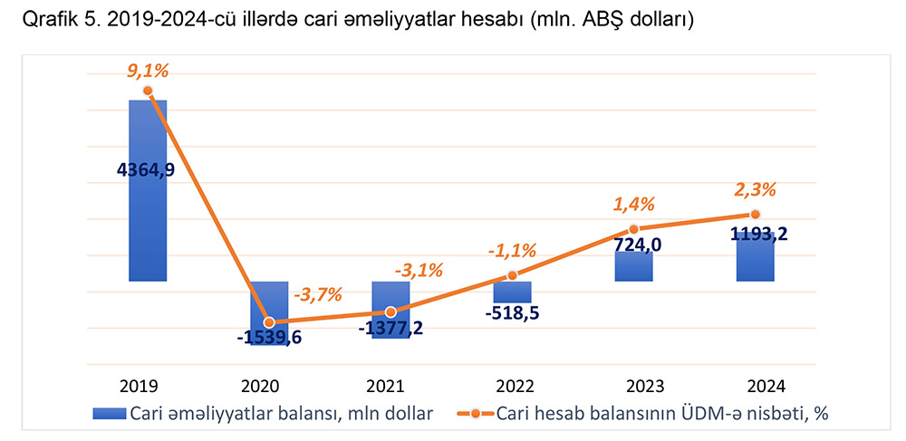 2020-ci ildə əsas ticarət tərəfdaşlarında valyuta məzənnələrindəki dalğalanmalara, həmçinin daxili valyuta bazarında xüsusilə mart ayından başlayaraq ayrı-ayrı dövrlərdə manatın məzənnəsinə qarşı təzyiqin artmasına baxmayaraq, 2020-ci ildə bazarın yüksək likvidliyi və manatın məzənnəsinin sabitliyi qorunmuşdur. Dünyada koronavirus infeksiyasının yayılmasının qlobal iqtisadiyyata mənfi təsirlərinin artdığı şəraitdə bu ilin ilk rübündə cari əməliyyatlar hesabının profisiti ötən ilin müvafiq dövrünə nisbətən 2,5 dəfə azalsa da 646,0 mln. ABŞ dolları olmaqla müsbət saldo təşkil etmişdir.