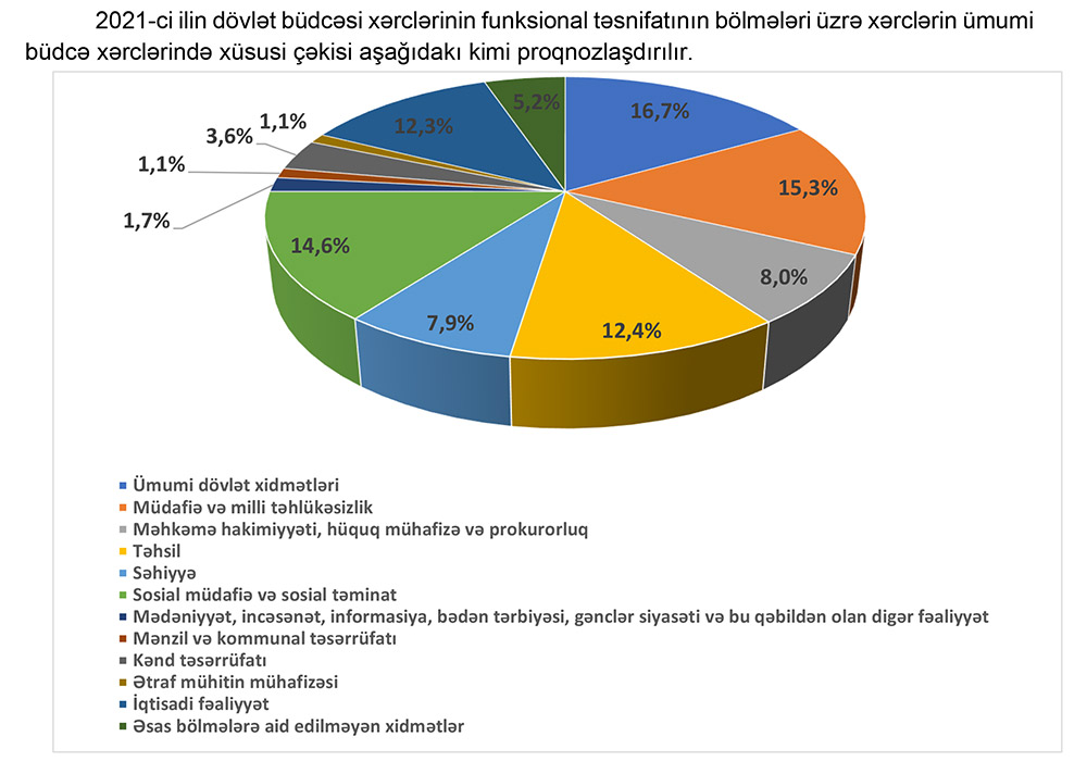 2021-ci ilin dövlət büdcəsini əsas səciyyələndirən xüsusiyətlərindən biri sosialyönlü xərclərin ümumi büdcə xərclərində xüsusi çəkisinin 42 faiz təşkil etməsidir. Həmçinin, COVID19 pandemiyası ilə mübarizə tədbirlərinin 2021-ci ildə də davam etdirilməsi ilə bağlı xərclərin maliyyələşdirilməsi üçün 600,0 milyon manat məbləğində vəsait proqnozlaşdırılmışdır.