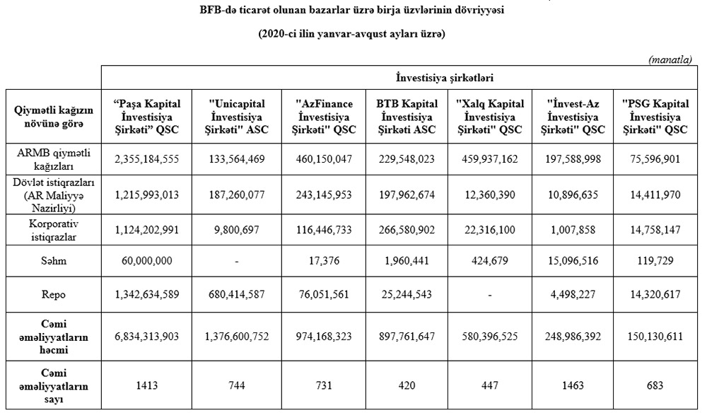 Marja Birjaya istinadən xəbər verir ki, 2020-ci ilin yanvar-avqust ayları ərzində “Paşa Kapital İnvestisiya Şirkəti” QSC 6 milyard 834 milyon 314 min manat dövriyyə ilə 1-ci, "Unicapital İnvestisiya Şirkəti" ASC 1 milyard 376 milyon 600 min manat dövriyyə ilə 2-ci və "AzFinance İnvestisiya Şirkəti" QSC 974 milyon 168 min manat dövriyyə ilə 3-cü olub.