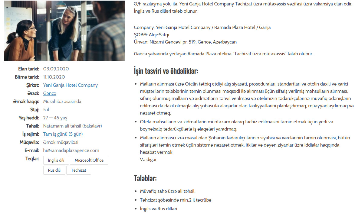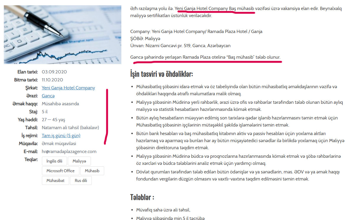 Diqqəti cəlb edən “Yeni Gəncə Hotel Company”nin Gəncədəki “Ramada Plaza Hotel” ilə eyni ünvanda yerləşməsidir. Şirkətin vakansiya elanlarında “Yeni Gəncə Hotel Company” MMC-yə tələb olunan işçilərin “Ramada Plaza Hotel” üçün çalışacaqları qeyd olunub.