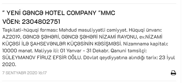 Marja xəbər verir ki, 10 min manat nizamnamə kapitalı olan şirkətin hüquqi ünvanı Gəncə şəhəri, Nizami rayonu, Nizami küçəsi ilə Şahsevənlər küçəsinin kəsişməsidir. “Yeni Gəncə Hotel Company”nin qanuni təmsilçisi Süleymanov Firuz Efsir oğludur.