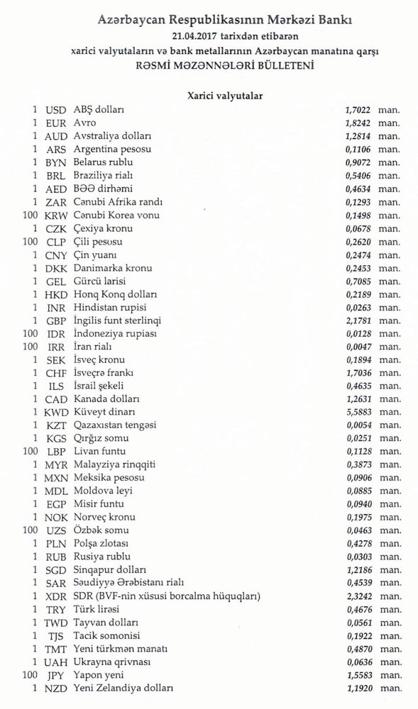 Aprelin 20-də rəsmi olaraq 1 dollar 1,7022 manata, 1 avro isə 1.8260 manata bərabər idi.