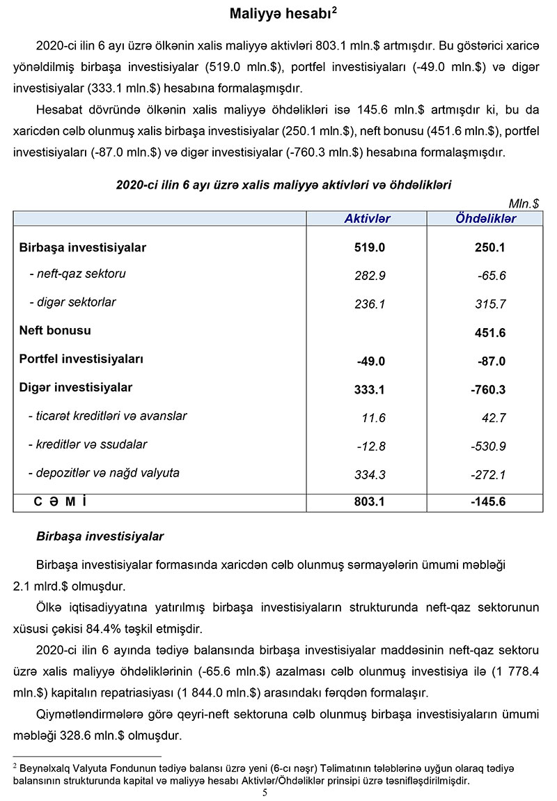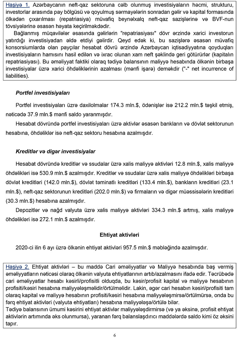 "Xarici mühitin əlverişsiz olduğu bir şəraitdə 2020-ci ilin 6 ayı üzrə tədiyə balansının1 əsas maddələri olan cari əməliyyatlar balansında (CƏB) 598.2 milyon dollar profisit, kapital və maliyyənin hərəkəti hesabında isə 956.4 milyon dollar kəsir yaranmış, ehtiyat aktivləri 957.5 milyon dollar azalmışdır. Bu dövrdə orta neft qiyməti 41.9 dollar/barel olmuş, qeyri-neft ixracı isə 6.1% azalmışdır“, - Mərkəzi Bankın məlumatında bildirilir.