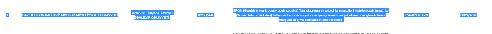 Nəqliyyat, Rabitə və Yüksək Texnologiyalar Nazirliyinə məxsus "Bakı Telefon Rabitəsi" MMC GPON (Giqabit imkanlı passiv optik şəbəkə) texnologiyasının tətbiqi ilə mənzillərin telefonlaşdırılması, LTE (Simsiz Telefon Rabitəsi) texnologiyalarının tətbiqi ilə baza stansiyalarının quraşdırması və şəbəkəsinin genişləndirilməsi üçün elan etdiyi açıq tenderə yekun vurub.
