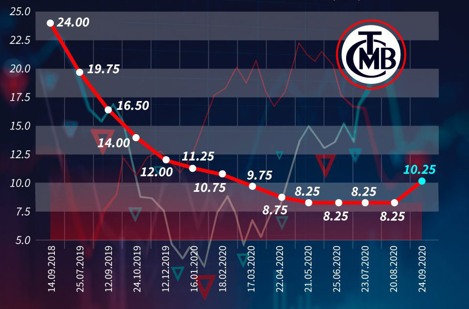 Türkiyə Mərkəzi Bankı əvvəlki 9 yığıncağında 24%-dən 8,25%-ə-dək faiz endirmiş, 3 yığıncağında faizi dəyişməz saxlamışdı.