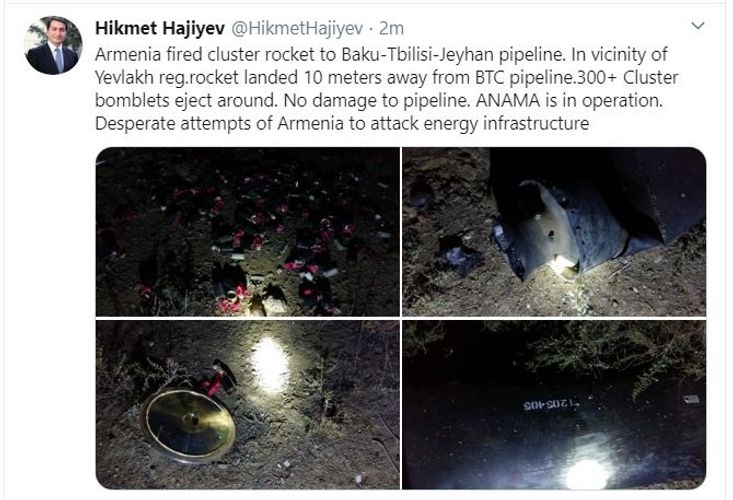“300+ kaset tipli bombaların qəlpələri ətrafa yaılıb. Boru kəmərinə ziyan dəyməyib. ANAMA hadisə yerində fəaliyyət göstərir. Çarəsiz Ermənistanın enerji infrastrukturuna hücum cəhdləri boşa çıxıb”, deyə H.Hacıyev vurğulayıb.