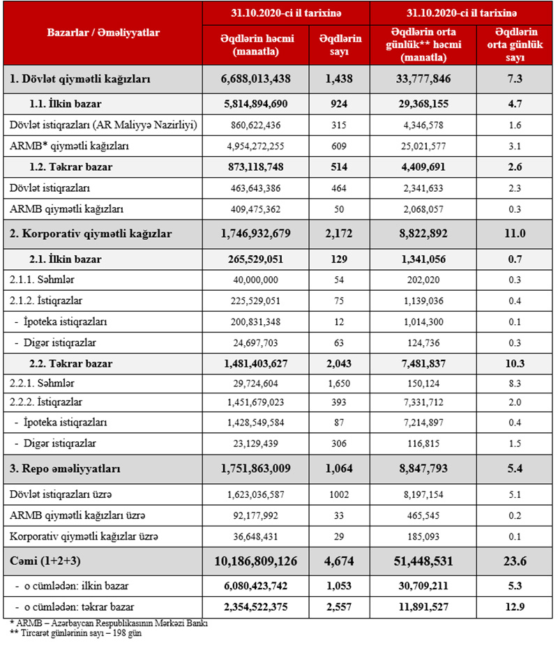 Bakı Fond Birjasında 2020-ci ilin yanvar-oktyabr ayları ərzində qiymətli kağızlar üzrə keçirilən əməliyyatların ümumi həcmi 10 milyard 186 milyon 809 min 126 manat təşkil etmişdir. Bu, ötən ilin eyni dövrü ilə müqayisədə 16% azdır.
