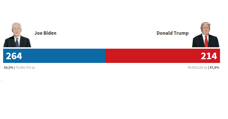 Marja xəbər verir ki, 270 seçici nümayəndəsinə çatmaq üçün keçirilən seçki yarışında Demokratların namizədi Biden 264 nümayəndəyə çataraq böyük üstünlük təmin edib. Hazırkı Prezident, Respublikaçılar Partiyasının namizədi Donald Trump isə 214 nümayəndə qazanıb.