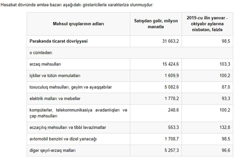 Dövlət Statistika Komitəsinin yaydığı məlumata görə, 2019-cu ilin müvafiq dövrü ilə müqayisədə pərakəndə ticarət dövriyyəsi real ifadədə 1,5 faiz, o cümlədən qeyri-ərzaq malları üzrə 6,1 faiz azalmış, ərzaq məhsulları, içkilər və tütün məmulatları üzrə isə 3,0 faiz artmışdır. Elektron ticarət dövriyyəsi ötən ilin yanvar-oktyabr ayları ilə müqayisədə 2,4 dəfə çox olmuşdur.