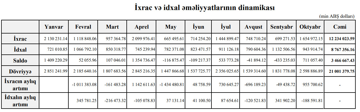 Qeyd edək ki, 2019-cu ilin 10 ayı ərzində Azərbaycanın xarici ticarət əməliyyatlarının həcmi 28 milyard 276 milyon 885 min ABŞ dolları, o cümlədən ixrac 16 milyard 821 milyon 557 min ABŞ dolları, idxal isə 11 milyard 455 milyon 326 min ABŞ dolları təşkil etmişdi.