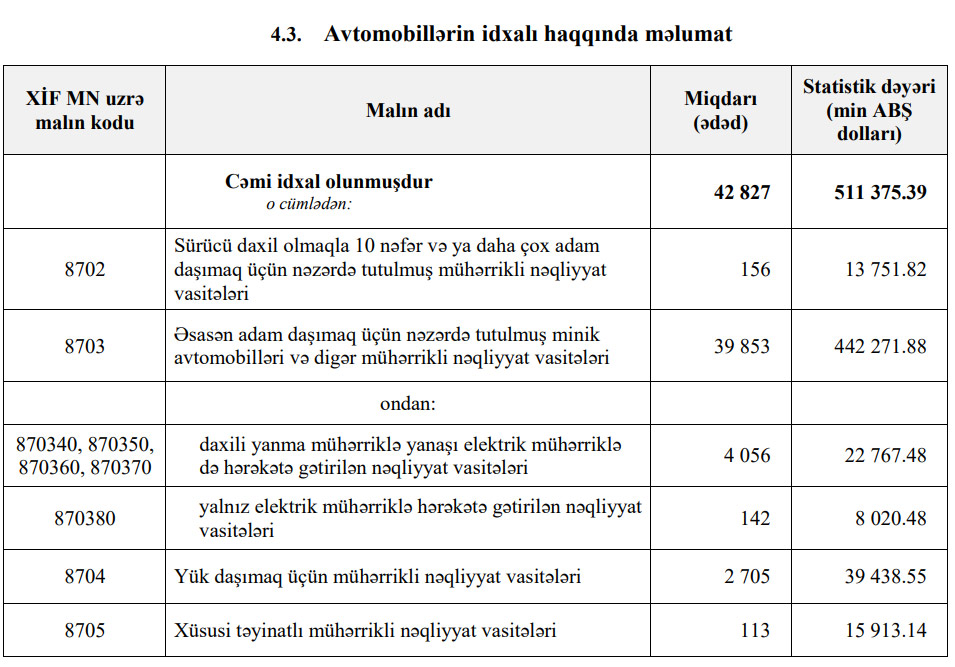 Cari ilin 10 ayında ayda ölkəmizə 39 min 853 ədəd minik avtomobili, 156 ədəd avtobus, 2 min 705 ədəd yük avtomobili və 113 ədəd xüsusi təyinatlı avtomobil idxal edilib.