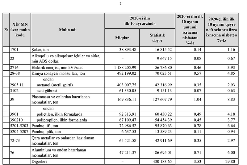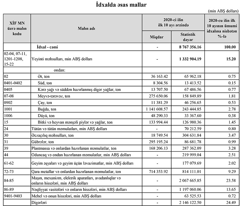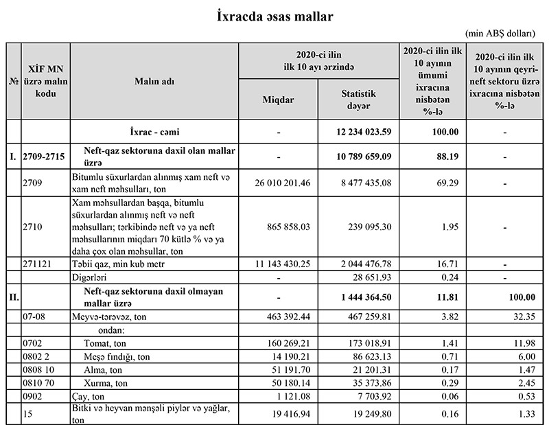 2020-ci ilin yanvar-oktyabr ayları ərzində (10 ayda) Azərbaycanın ən çox ixrac və idxal etdiyi mallar.