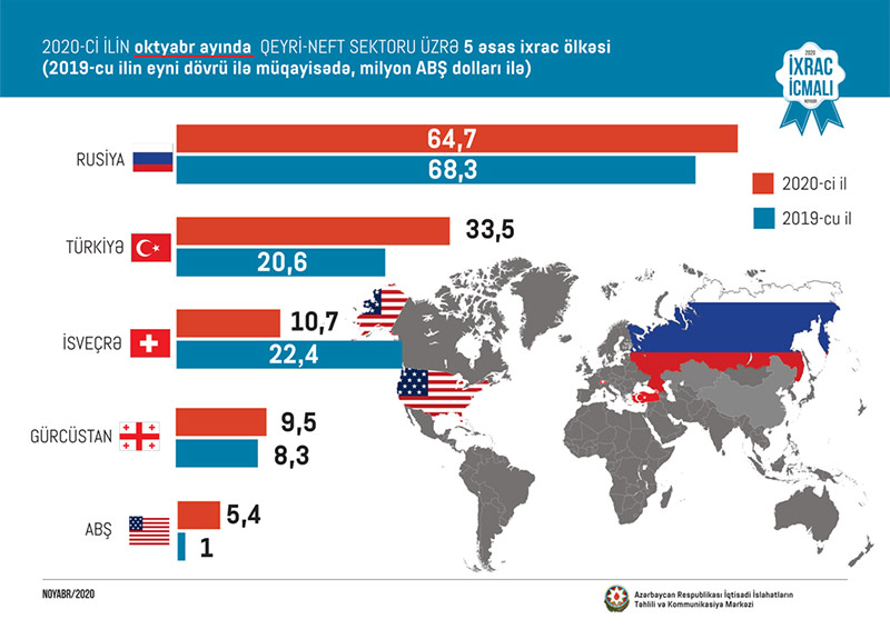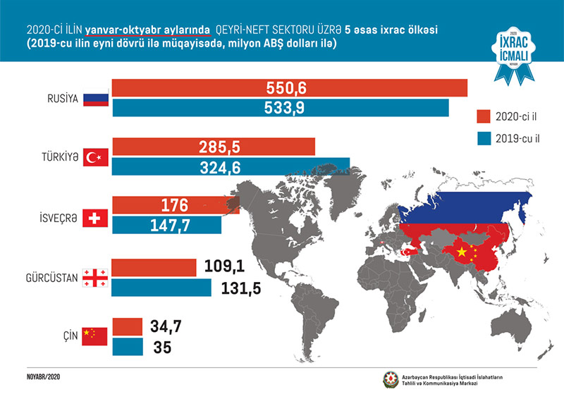 Bu ilin yanvar-oktyabr ayları ərzində Rusiyaya 550,6 milyon, Türkiyəyə 285,5 milyon, İsveçrəyə 176 milyon, Gürcüstana 109,1 milyon və Çinə 34,7 milyon ABŞ dolları dəyərində qeyri-neft sektoruna aid mal ixrac olunub.