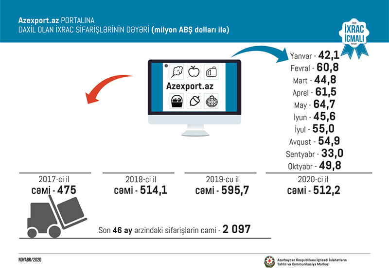 2020-ci ilin oktyabr ayında isə portala daxil olan ixrac sifarişlərinin dəyəri 49,8 milyon ABŞ dolları təşkil edib və ötən ilin müvafiq ayı ilə müqayisədə ixrac sifarişləri dəyər baxımından 21,5 faiz artıb. Cari ilin oktyabr ayında Azexport.az portalına ən çox ixrac sifarişi toyuq əti və yumurtası, pambıq yağı, fındıq, tütün, çay, günəbaxan yağı, alma, şərab, qənnadı məhsulu, ketçup, nar, armud, kosmetik vasitə mühərrik yağı, bal, boya, zəfəran, tibbi zəli və s. mallara daxil olub. 2017-ci ilin yanvar ayından 2020-ci ilin 31 oktyabr tarixinə kimi (46 ay ərzində) Azexport.az portalına dünyanın 142 ölkəsindən daxil olan ixrac sifarişlərinin dəyəri 2,9 milyard ABŞ dolları təşkil edib.