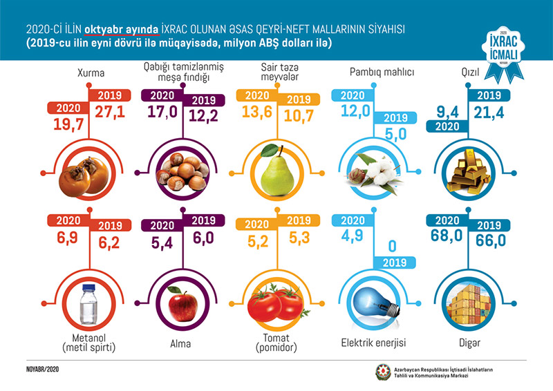 2020-ci ilin oktyabr ayında qeyri-neft sektoru üzrə ixracda xurma ( 19.7 milyon) birinci, qabığı təmizlənmiş meşə fındığı ( 17 milyon ABŞ dolları) ikinci, sair təzə meyvələr – (13,6 milyon ABŞ dolları ) üçüncü yerdə qərarlaşıb.