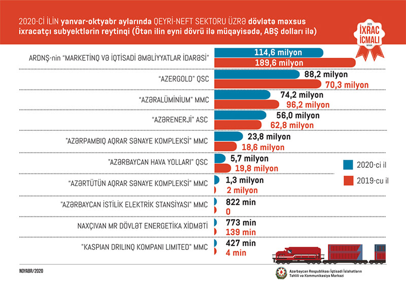 “İxrac İcmalı”nın noyabr sayında qeyri-neft sektoru üzrə əsas ixracatçı şirkətlərin reytinqi də təqdim edilib Bu ilin yanvar-oktyabr ayları üzrə hazırlanan qeyri-dövlət ixracatçı subyektlərin reytinqində ilk onluqda aşağıdakı şirkətlər təmsil olunurlar: “Socar Polymer” MMC, "Azərbaycan İnterneyşnl Mayninq Kompani Limited Şirkəti"nin Azərbaycan Respublikasındakı nümayəndəliyi, "Land Lojistic" MMC, "MKT İstehsalat Kommersiya" MMC, "Sun Food" MMC, "Global Trade Group" MMC, "Fruit Store" MMC, "Baku Steel Company", “Aqrovest” MMC və "Fruit City Group" MMC.