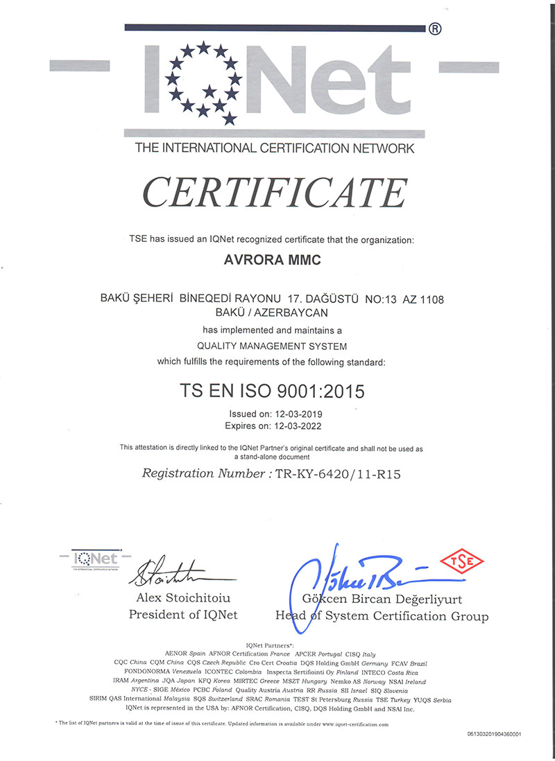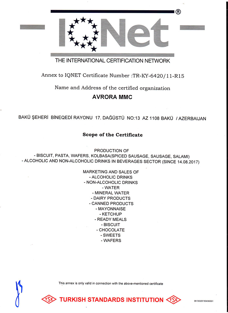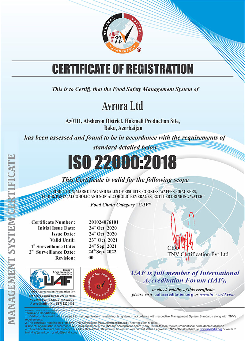 Avrora Qrup beynəlxalq standartların tətbiqi ilə bağlı layihələrini davam etdirərərk İSO 22000:2018 Qida Təhlükəsizliyi Menecmenti Sistemi sertifikatını əldə edib. Bundan əvvəl Avrora şirkəti İSO 9001:2015 Keyfiyyətin İdarə edilməsi sistemi üzrə sertifikatı əldə etmişdi.