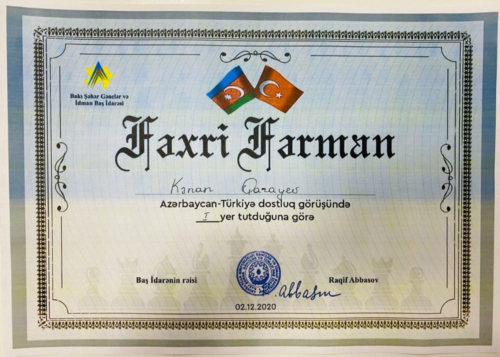 Bundan əlavə, Kənan Qarayev dekabrın 2-də Azərbaycan və Türkiyə milli komandaları arasında blits üzrə “Qarabağ Azərbaycandır!” şüarı altında internet üzərindən keçirilən dostluq turnirində də iştirak edib. Kənan Qarayev bu dəfə də fərqlənərək turnirdə 1-ci yerə layiq görülüb.