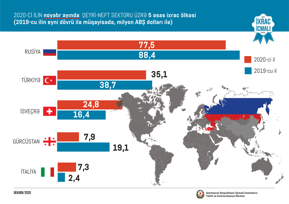“İxrac İcmalı”nın 2020-ci ilin dekabr sayı təqdim edilibİqtisadi İslahatların Təhlili və Kommunikasiya Mərkəzinin “İxrac İcmalı”nın dekabr sayında göstərilib ki, 2020-ci ilin ilk on bir ayı ərzində Azərbaycanın ixracı 13,1 milyard ABŞ dollar olub.